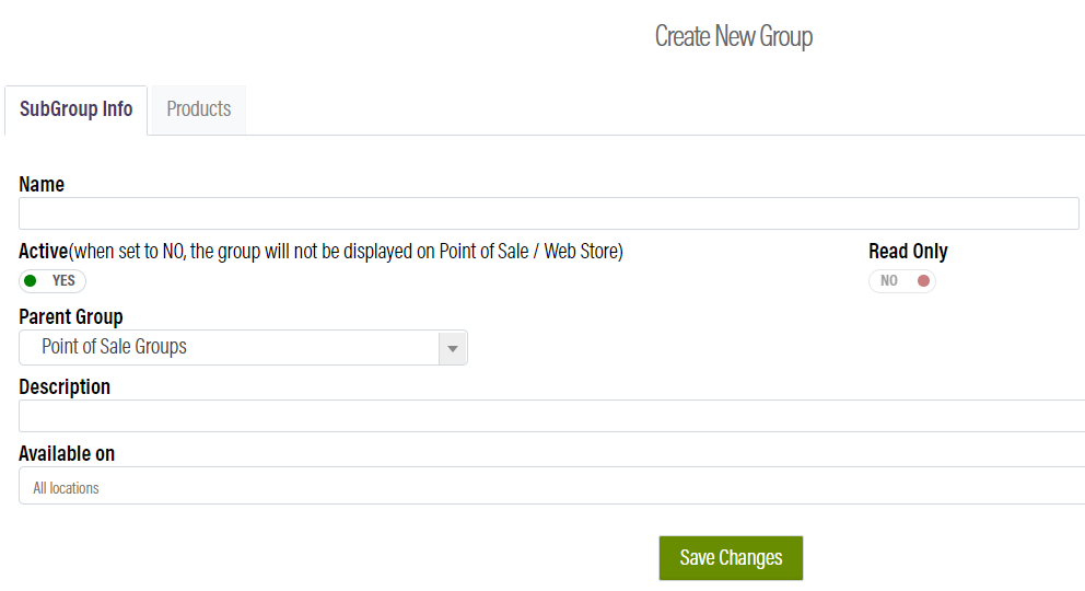 When building a new group, you need to give it a name. You can make it a subgroup of an already existing group as well. You may give it a description, and on the POS, you may restrict it from displaying in certain tasting rooms.