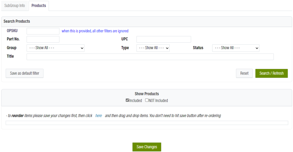 After saving the items within the group, you can reorder items within the group by clicking “here” above the products in the group.