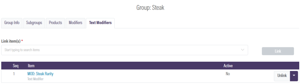 To add text modifiers to the modifier group, go to the Text Modifiers tab. Next, start typing the modifiers you’d like to link. Once you are finished adding the items, click “link” and save the changes.