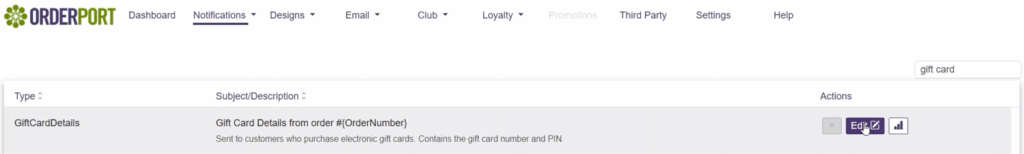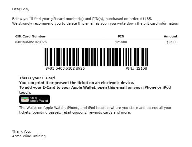 When an order is completed with a gift card, the customer’s email receipt will contain a button to request the gift card number. When clicked, they will receive the Gift Card Details notification.