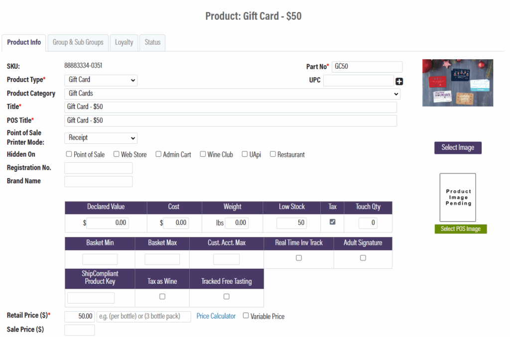 Change the product type to Gift Card, then fill out the product information. The Title should include the card balance, and the Retail Price should be set to the same number. You cannot sell variable price items on the Webstore.