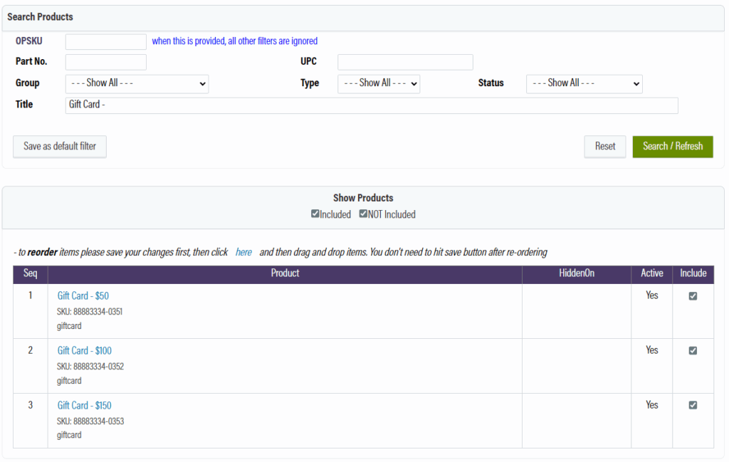 Next, go to the products tab, search for your gift card products, then select Not Included. Add the gift card products, then save the changes. To add new products to the group, make sure to select “NOT Included” under the show products filter.
