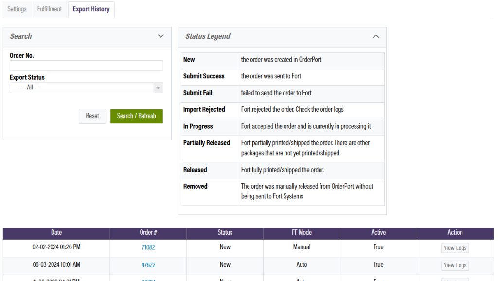 If you need to review the orders that have been sent to the warehouse, go to Export History. Here, you can also find orders that have failed to be submitted to the warehouse.