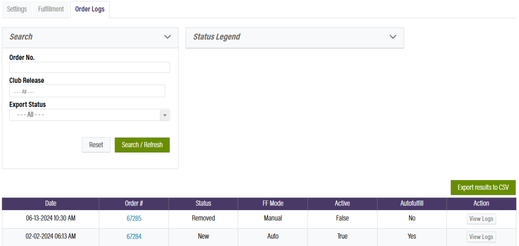 A history of all Wineshipping orders can be found in the Order Logs tab. Use the Status Legend to understand the status of each order.