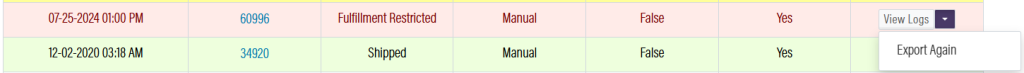 When an order fails to be fulfilled, you may attempt to re-export the order. View the logs, address the issues, then use the drop down to export the order again.