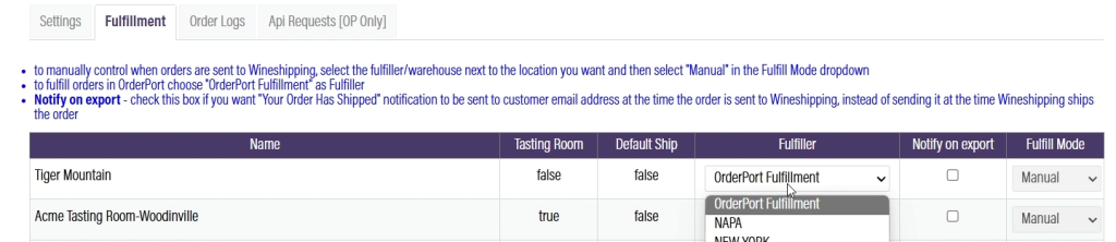 Next you will choose the fulfillment mode. There are two options: automatic and manual. Automatic mode will send orders through Wineshipping to your warehouse as soon as the order is paid for, without any action on your part. Manual mode will put the orders into the OrderPort Fulfillment module where you will be prompted to push them to Winehsipping or fulfill them yourself. Once you have selected your Fulfiller and Fulfillment mode, click Save Changes.
