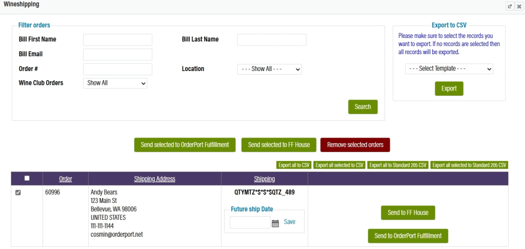 Now, for each order, you will have the option to fulfill the order yourself, or to send it off to the warehouse. To fulfill it yourself, send the orders to OrderPort Fulfillment. To send it to the warehouse, click FF House.