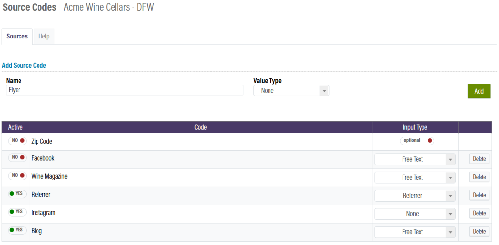 Once in the Source Codes module, you can add new source codes by adding a name and a value type. There are three value types: