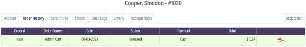 Under this tab, you will find a complete history of this customer’s orders. You can view the order by clicking on the order number to the left. You can view a pdf of the receipt using option to the right.