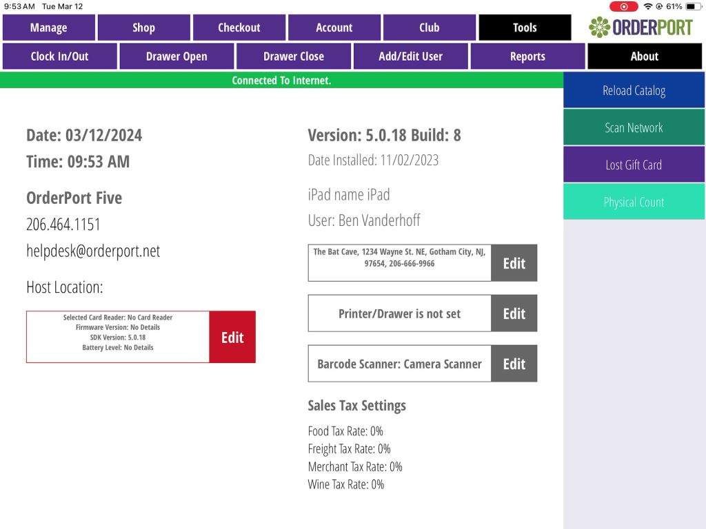 Once in the Point of Sale, go to the tools tab. From here, select About. On the left side of this screen, you will find the card reader section. Turn on the card reader, then tap Edit. The device will start searching for available card readers.