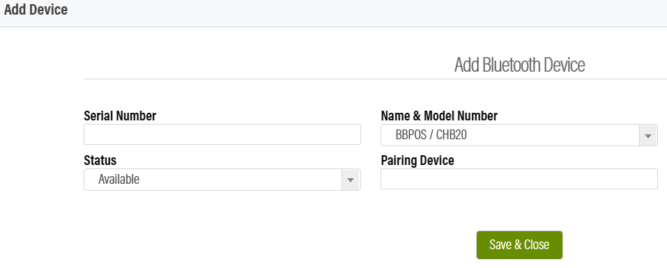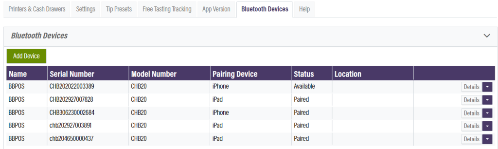 Once the reader is added to the backend, it can be added to the Point of Sale. The pairing process is done within the Point of Sale only. Make sure that the reader is not paired to the device bluetooth. The reader should be fully charged prior to its first pairing.