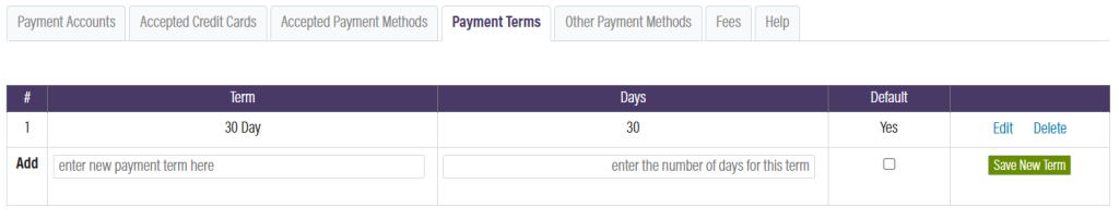 The next tab within the Payment Processing module is the Payment Terms tab. From here, you can add payment terms for purchase orders. This defines the period of time in which a customer must complete their purchase.