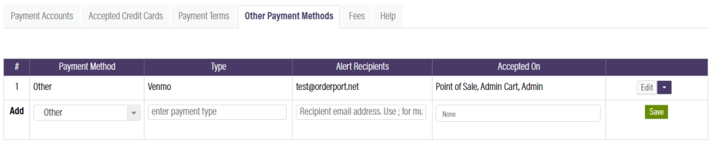If you ever need to keep track of payments that are not integrated with OrderPort, the Other Payments Tab is where you set that up. For example, you may want to take payments through Venmo.