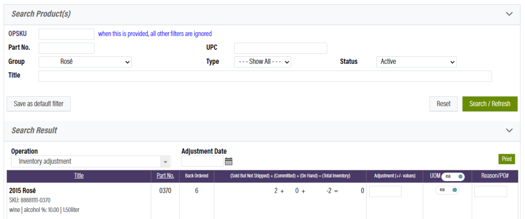 Viewing and adjusting inventory numbers is an important part of running any business. The inventory module allows you to view your product counts for a given warehouse, and also allows for adjustments.