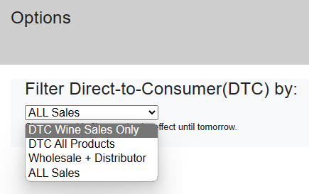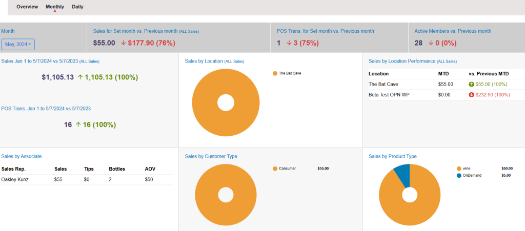 The first tab of the reporting dashboard is the overview tab. At the top, you can choose to filter by location if you have multiple tasting rooms you operate from. Under the settings button, you can also change the year that you are viewing statistics for. At the bottom of the overview page, you can view a quick overview of your sales by month. If you click on one of the bars in the graph, it will take you to the Monthly tab of the dashboard.