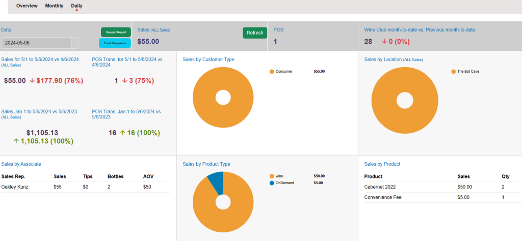 The reporting dashboard is designed to give you a quick overview of your sales. You can also automate a daily report email from the dashboard.