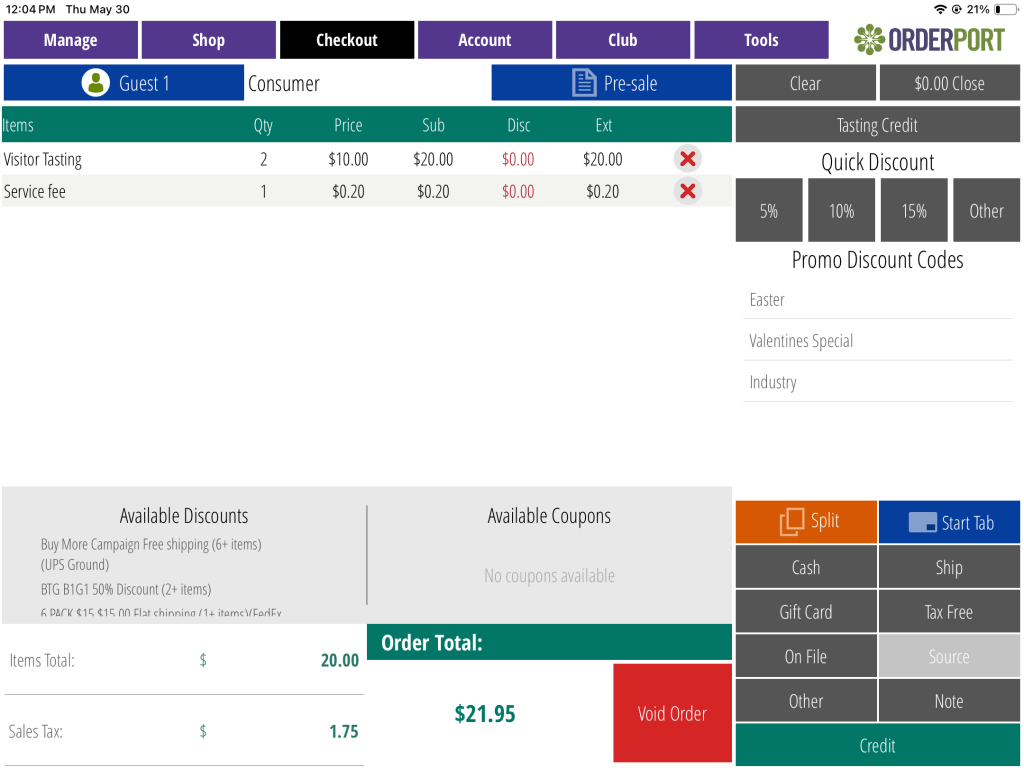 You may go back to the Manage page to start new orders at any time and come back to this one by tapping on the order circle. When the customer is ready to pay, proceed to the checkout page. To take the payment, you can use any of the payment methods at the bottom right of the page.
