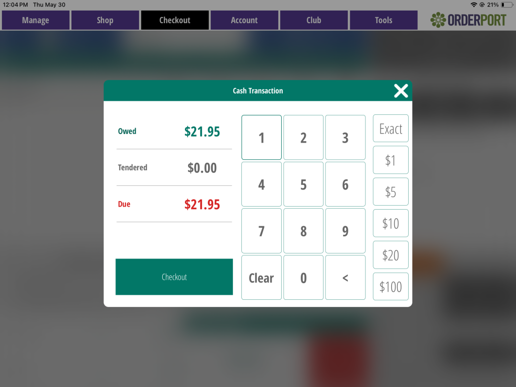 When you select the Cash option, you will see how much money is owed, and how much the customer has paid. The amount of cash tendered can be specified on the right using the dollar amount buttons. The Exact button automatically inputs the amount of money owed. The Change section shows you how much change the customer will need to receive. Tap checkout when finished.