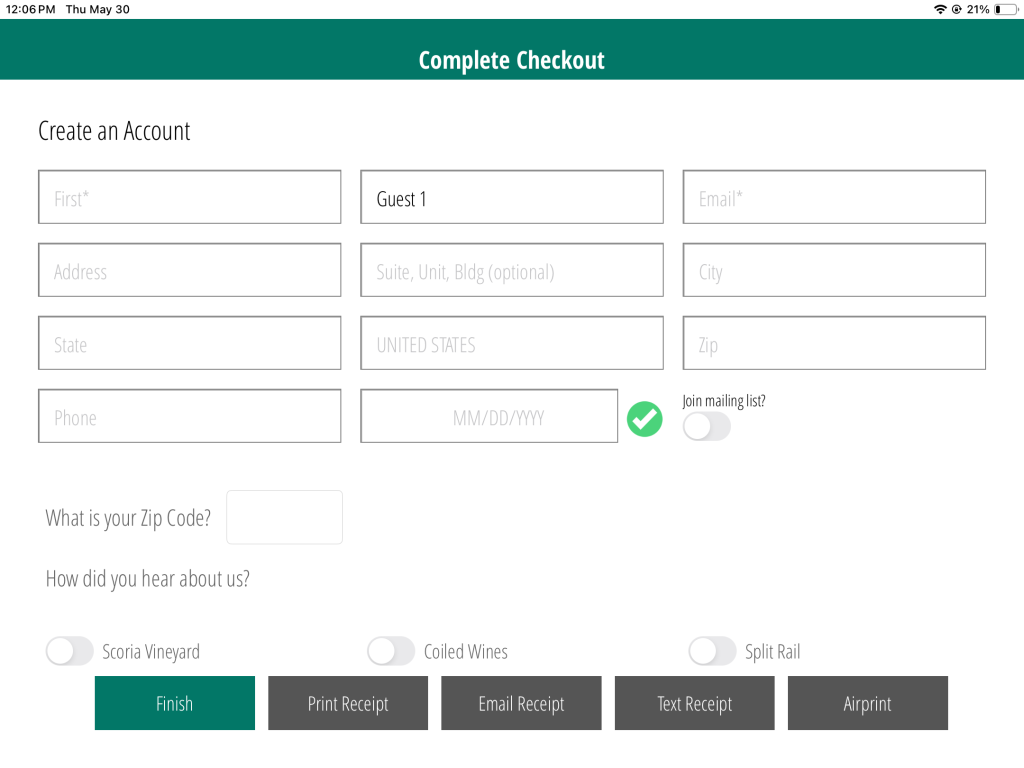 There are two ways to start an order. You can tap on Start to make an order for a guest without an account, or you can search for the customer’s account using any number of the four fields. Once you find their account, tap on their name to start an order.