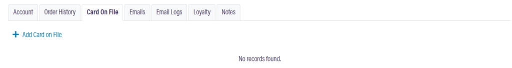 Open a customer account by clicking Details, then go to the Card on File tab.