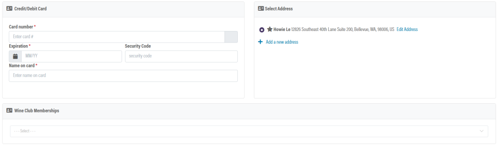 When you click Add Card on File, you will add the card info, select the billing address to the right, and optionally set the card as default payment for wineclub releases below.