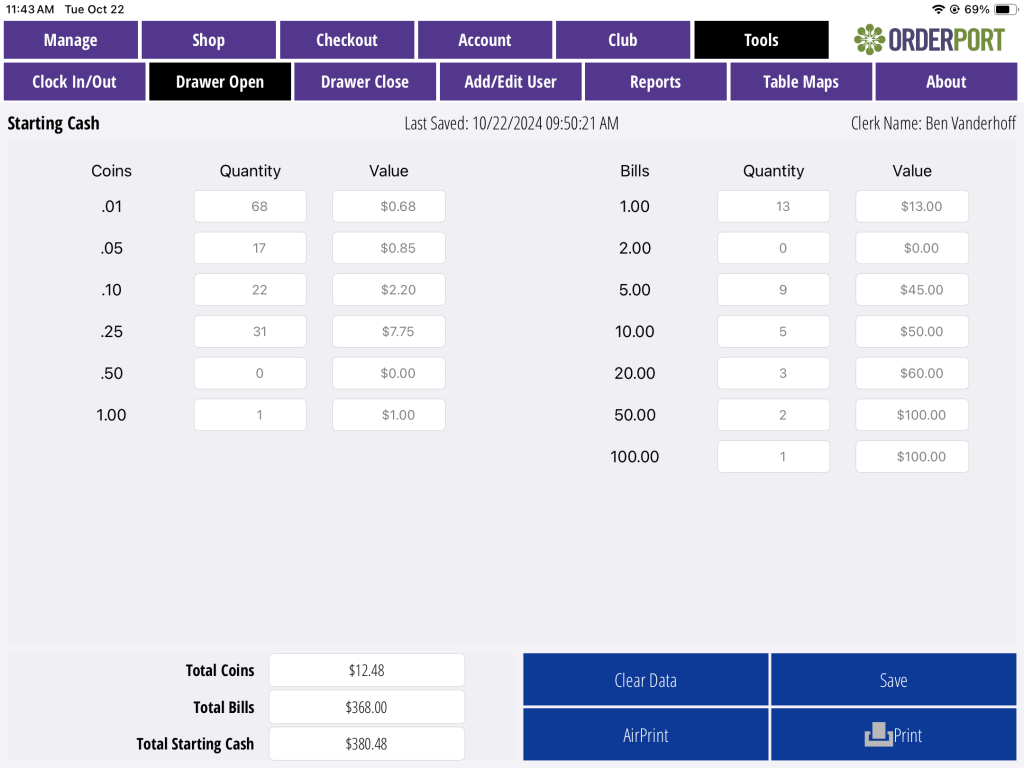 At the start of each day, you may go to the tools tab and tap Drawer Open. Count the coins and the bills in your cash drawer. Tap on the quantity sections to edit the amounts. When finished, save the changes.