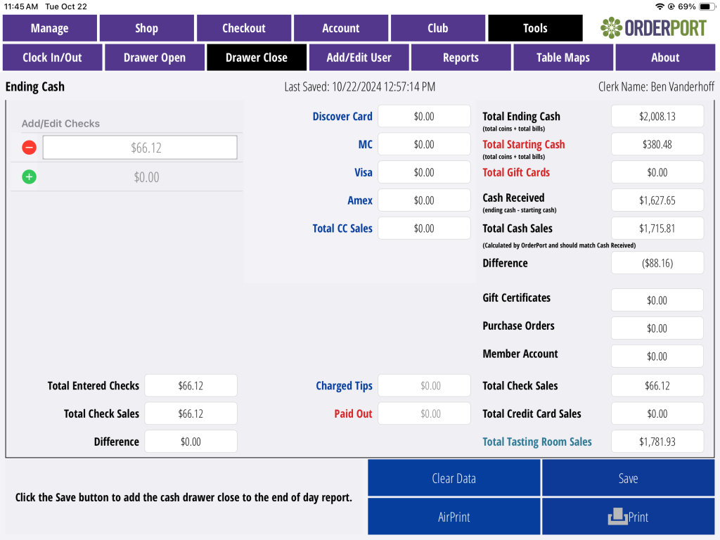 At the end of the day, repeat the count in the Drawer Close. In addition to adding the cash amounts, you can also enter in the checks you received for payment. Once you save the information, the total sales will be compared with the total bills and checks you received to find any discrepancy in the count.