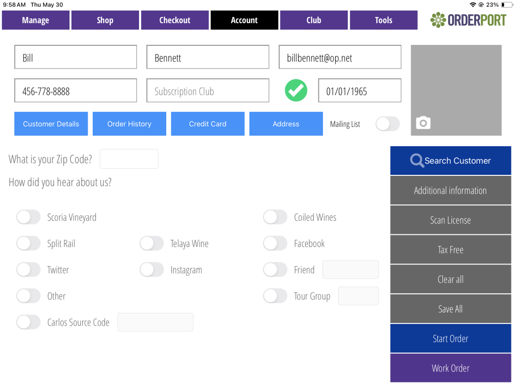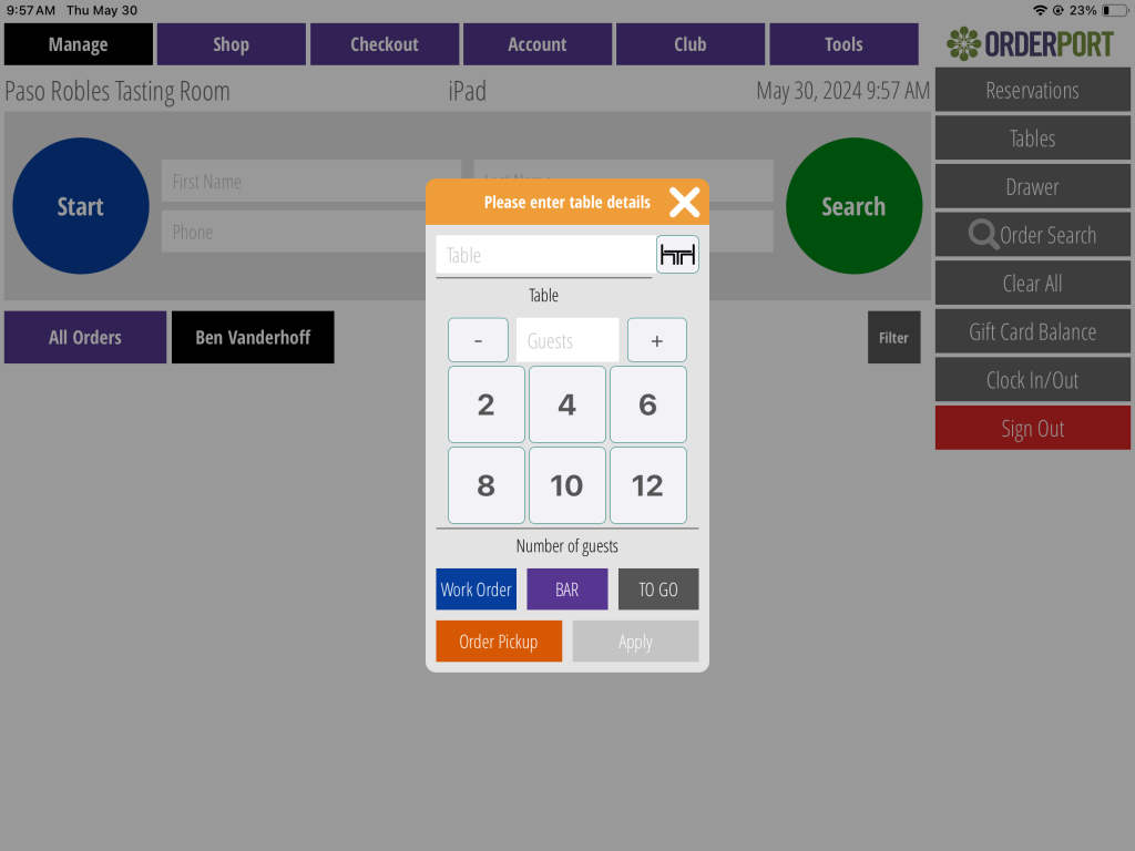Work orders are created on the point of sale, and they allow you to start an order, take payment, then save the order later. This is especially useful to take deposits for events. Open the OrderPort app on your device to begin.