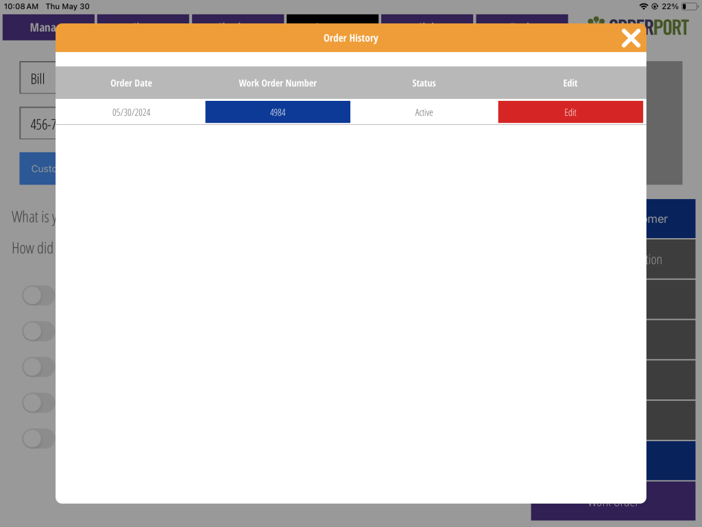 After you save a work order for later, you may access it through the account tab. Search for your customer, then you can find the order in the order history tab. The work orders will be separated at the top of the list. Tap edit to revisit the order.