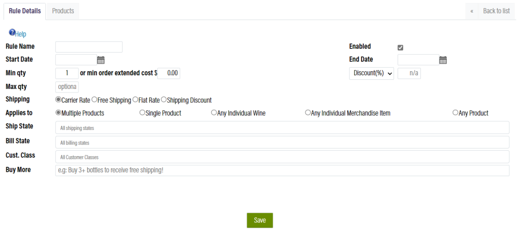 Applies to: This determines what products the discount rule applies to. For the first two options, you can configure which products are needed for the discount to apply in the Products tab of the rule.
