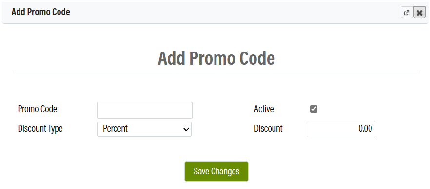 Promo Codes are codes that can be entered at checkout to receive a discount. They are managed in the Promo Codes tab, and they can be a percent discount, or a dollar discount.