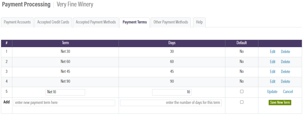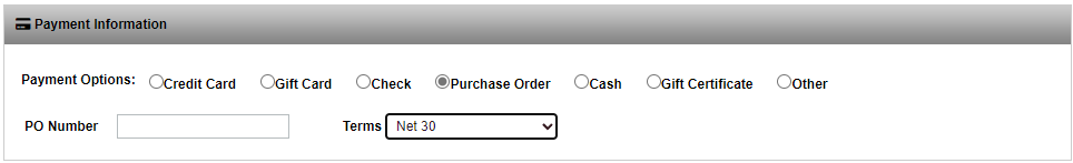 From the Payment Processing module, go to the Payments Terms tab. The terms you set up here will be options you can select at checkout when using purchase orders. Set up your default, and add any additional terms you may want to utilize.