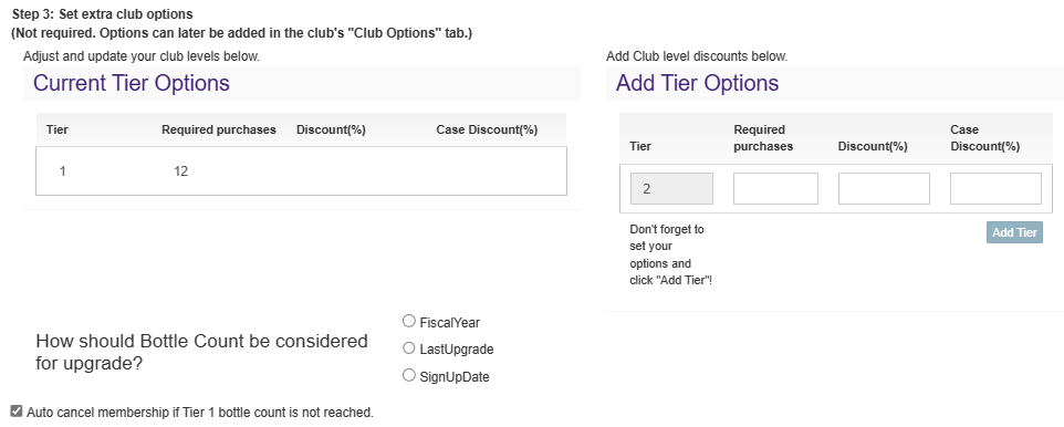 - Tiered clubs allow you to have different club levels, which means members who buy more wine can move up a tier to receive greater benefits. If they do not buy enough wine, they can be downgraded or removed from the club depending on their current tier level. Each tier can have its own discounts, meaning that you can sell products to different tiers for different prices and make certain products only available for certain tiers.