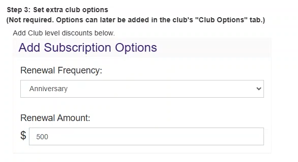 Under the Subscription options, select a renewal frequency. If you select anniversary, the customer will be charged each year.