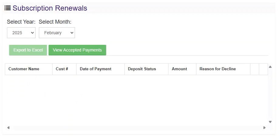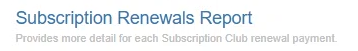 On the right of the Club Options page, you will notice the Subscription Renewals options. After a renewal occurs, you can select the month to view successful and failed charges.