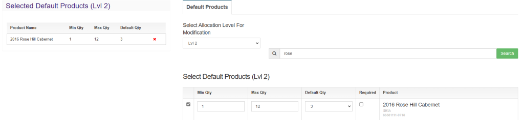 Go to the Club Options tab, then configure the default options of the release. You need to set up the default wines for each individual tier, even if all the defaults are the same. Search your catalog, then add minimum, maximum, and default quantities.