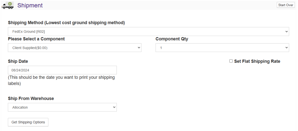 Step three is where you select the shipping method for your build. Even if this is a pickup only build, you will need to select a shipping method. The shipping component is for the packaging of the shipping. You can set up new components and component costs in the Shipping module, and the cost will be an additional charge to the club member. The ship date should be a future date where you anticipate printing labels.