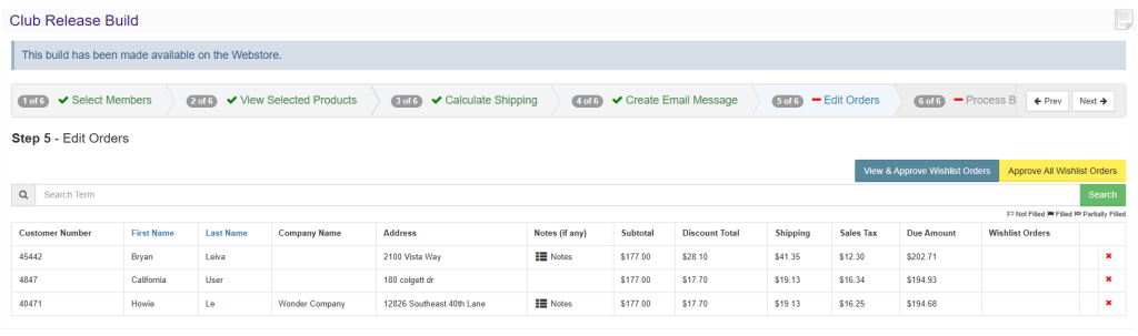 In step 5, all the orders for your members are listed. You can review orders and make edits if necessary. You can also remove members from the build by clicking on the X button to the right.