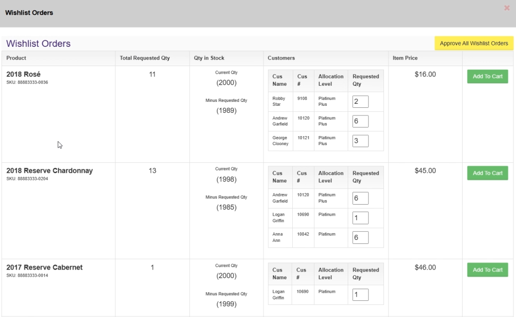 The wishlist orders column displays which customers have added to their wishlist, and whether there is sufficient inventory to fulfill it or not. Click View and Approve wishlist orders. Here, you can approve the wishlist requests by adding them to customers carts. You can also edit the quantity for partial fulfillment if necessary.